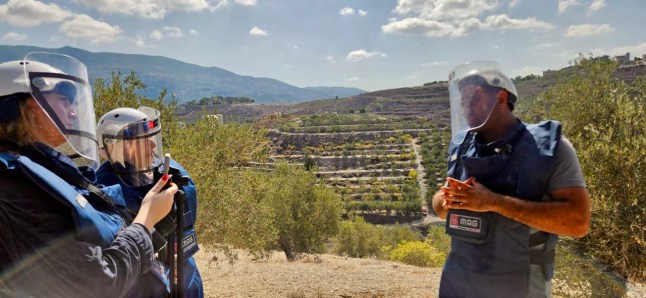 From a hilltop in the southern village of Kfarmelki,15 miles from the border with Israel,Metro watches as deminers in blast-resistant armour,carrying metal detectors,move from one patch to another.