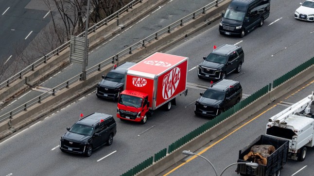 A red and white KitKat truck was filmed surrounded by security vehicles as it travelled down a highway in Toronto, Canada.